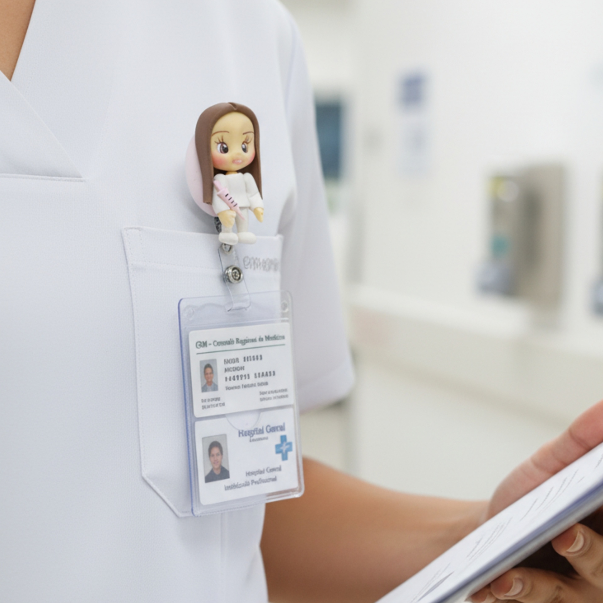 • Crachá hospitalar com figura de brinquedo e identificação numa bata branca