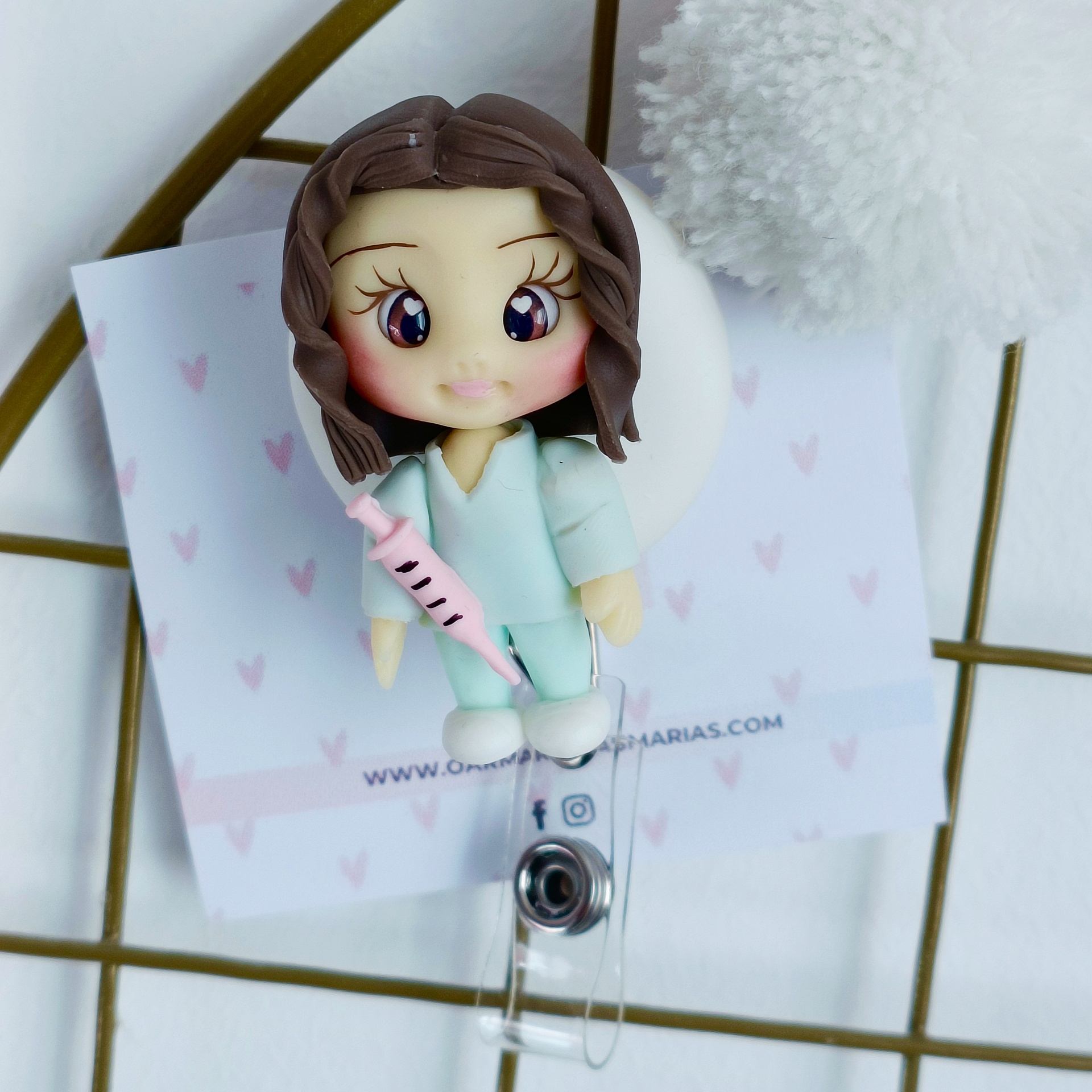 • Acessório crachá enfermeira com seringa rosa e roupa verde água