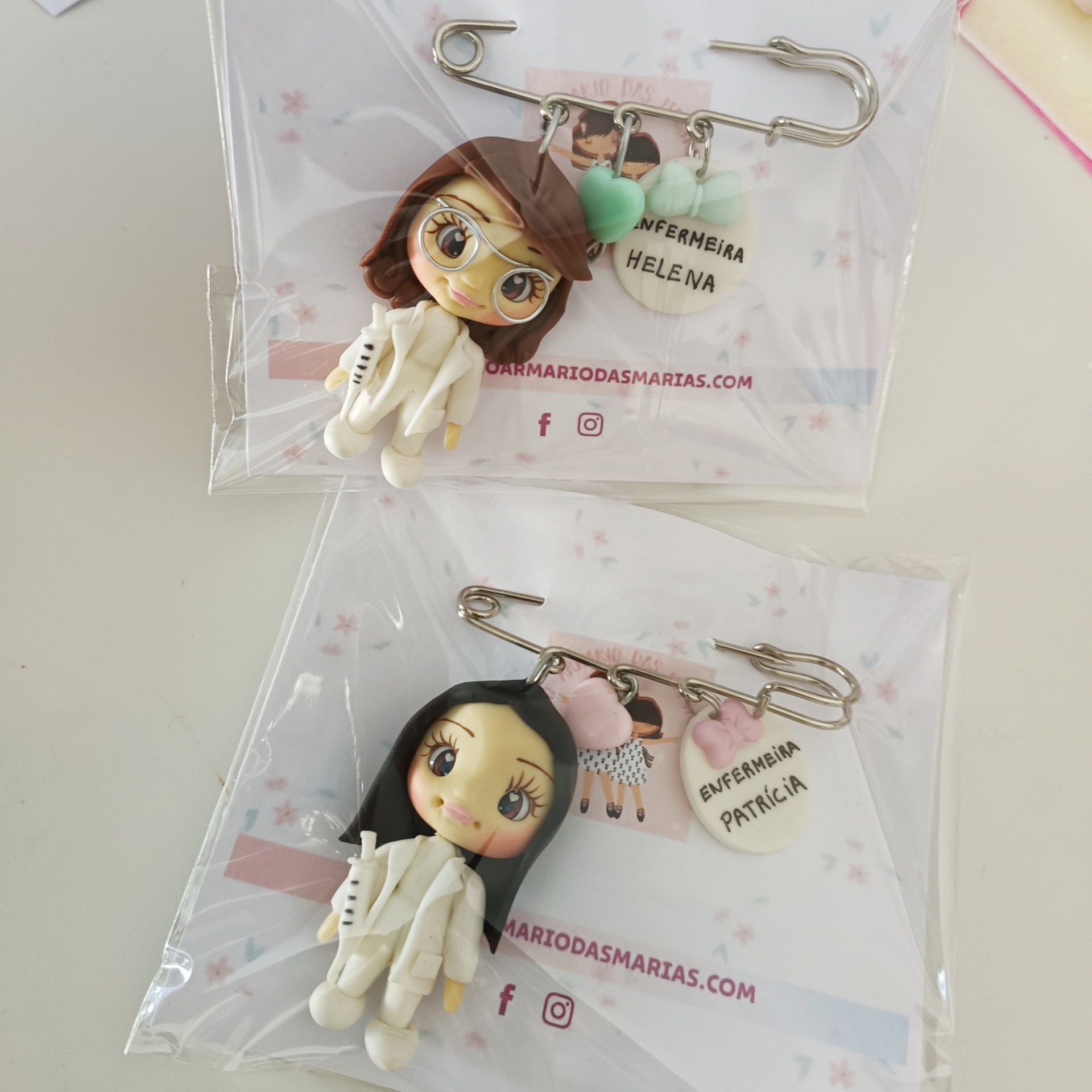 • Alfinetes de segurança com figuras de enfermeiras e placas com nomes