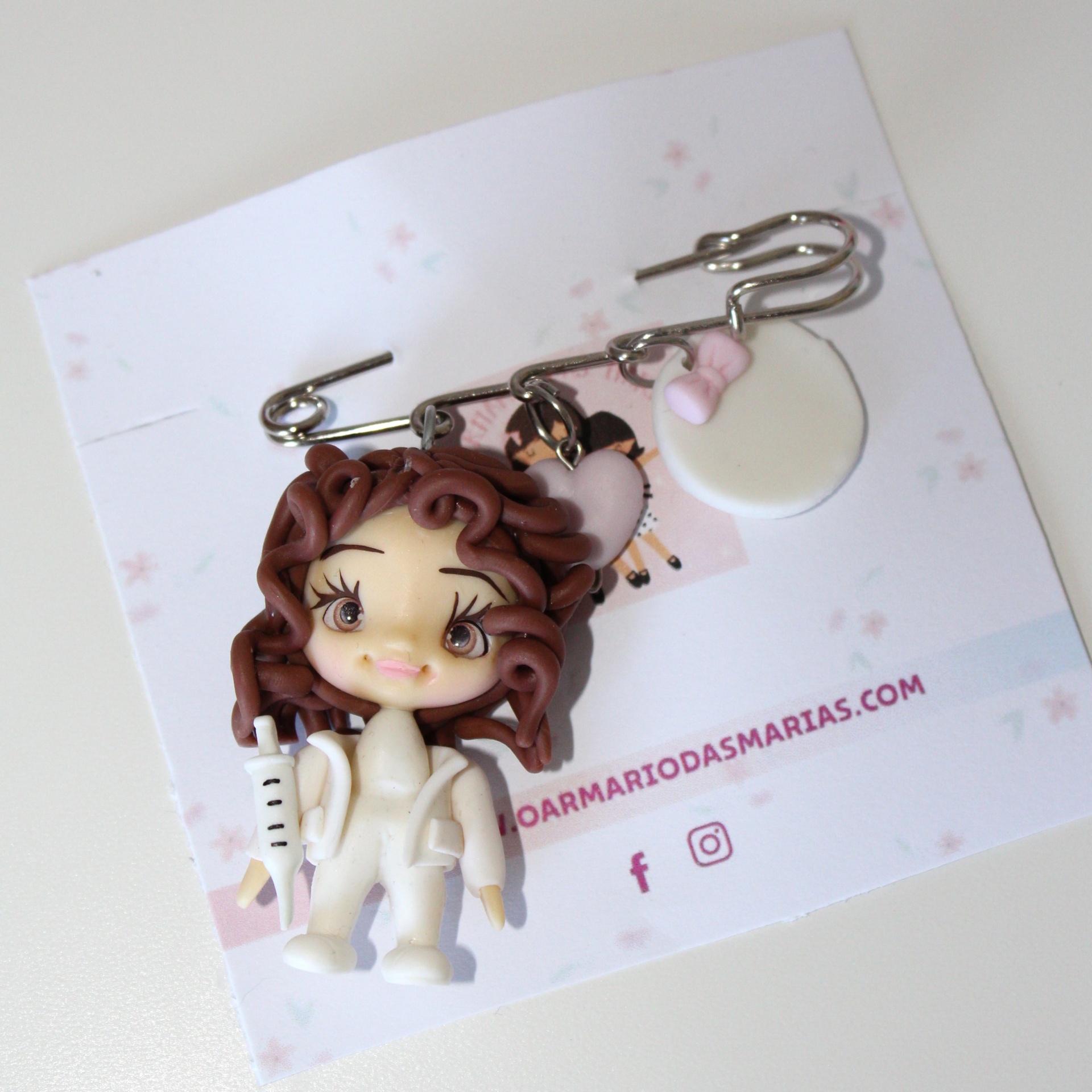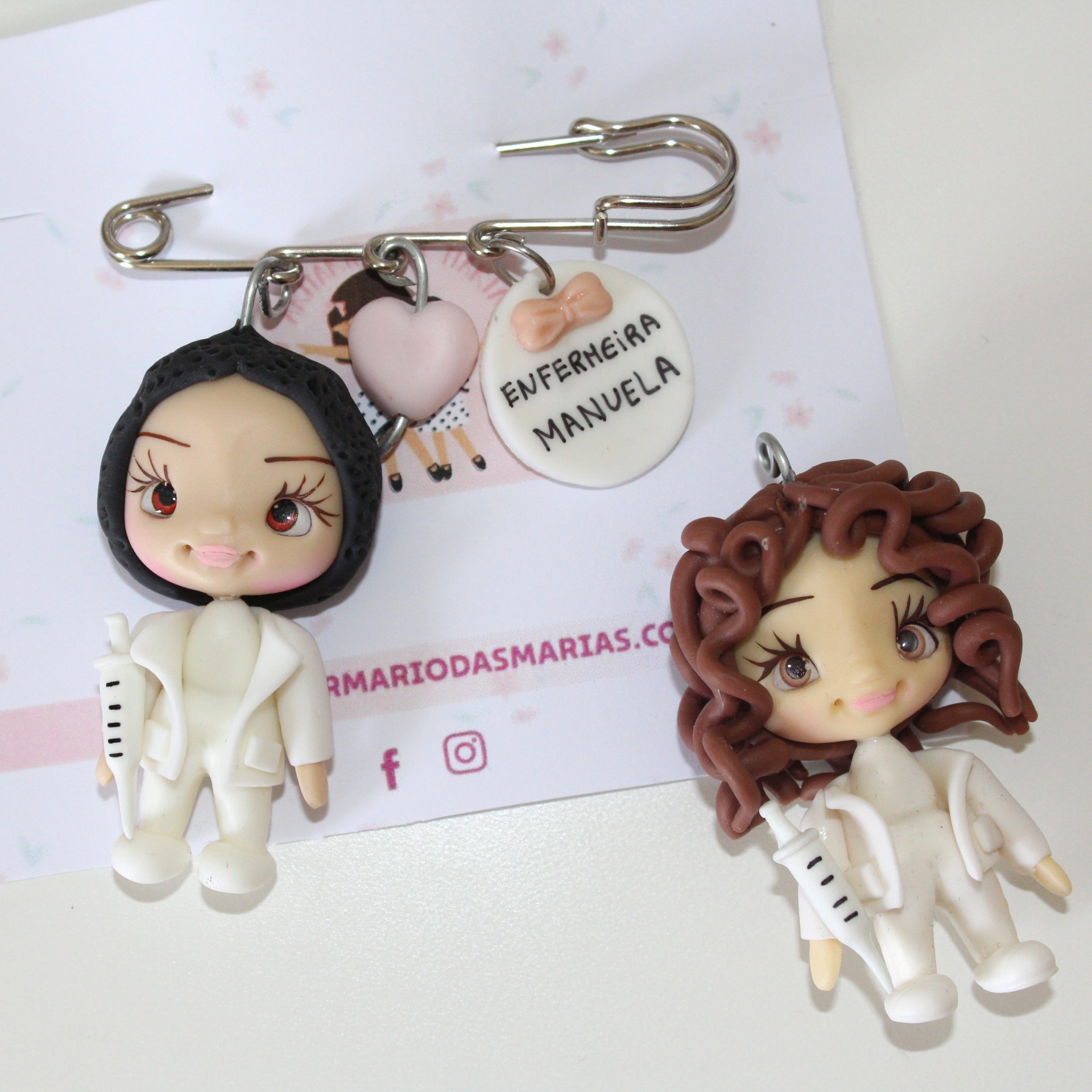 • Alfinete com bonequinhos de enfermeira em plástico e círculo com texto 'ENFERMEIRA MANUELA'.