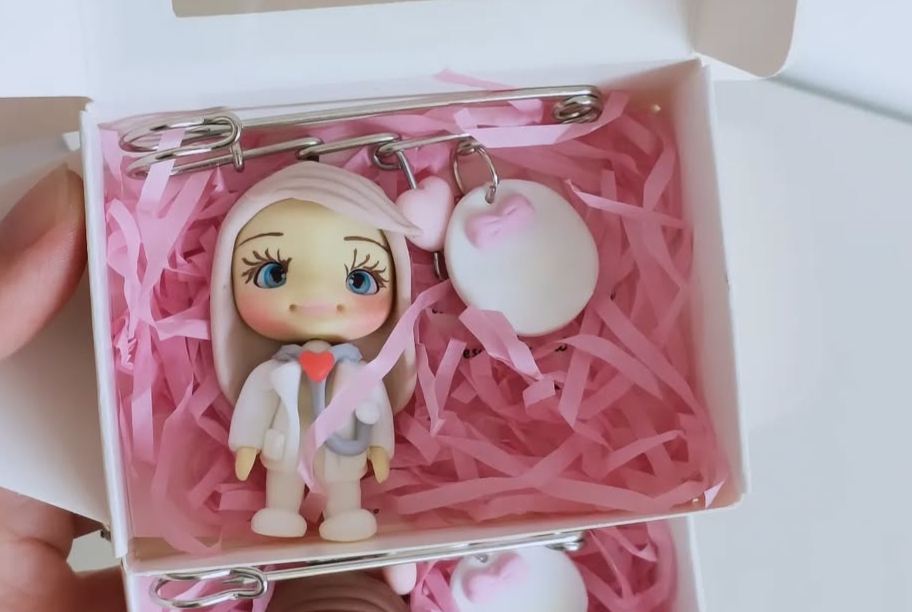 Broche com pendente de boneco em caixa branca com enchimento rosa