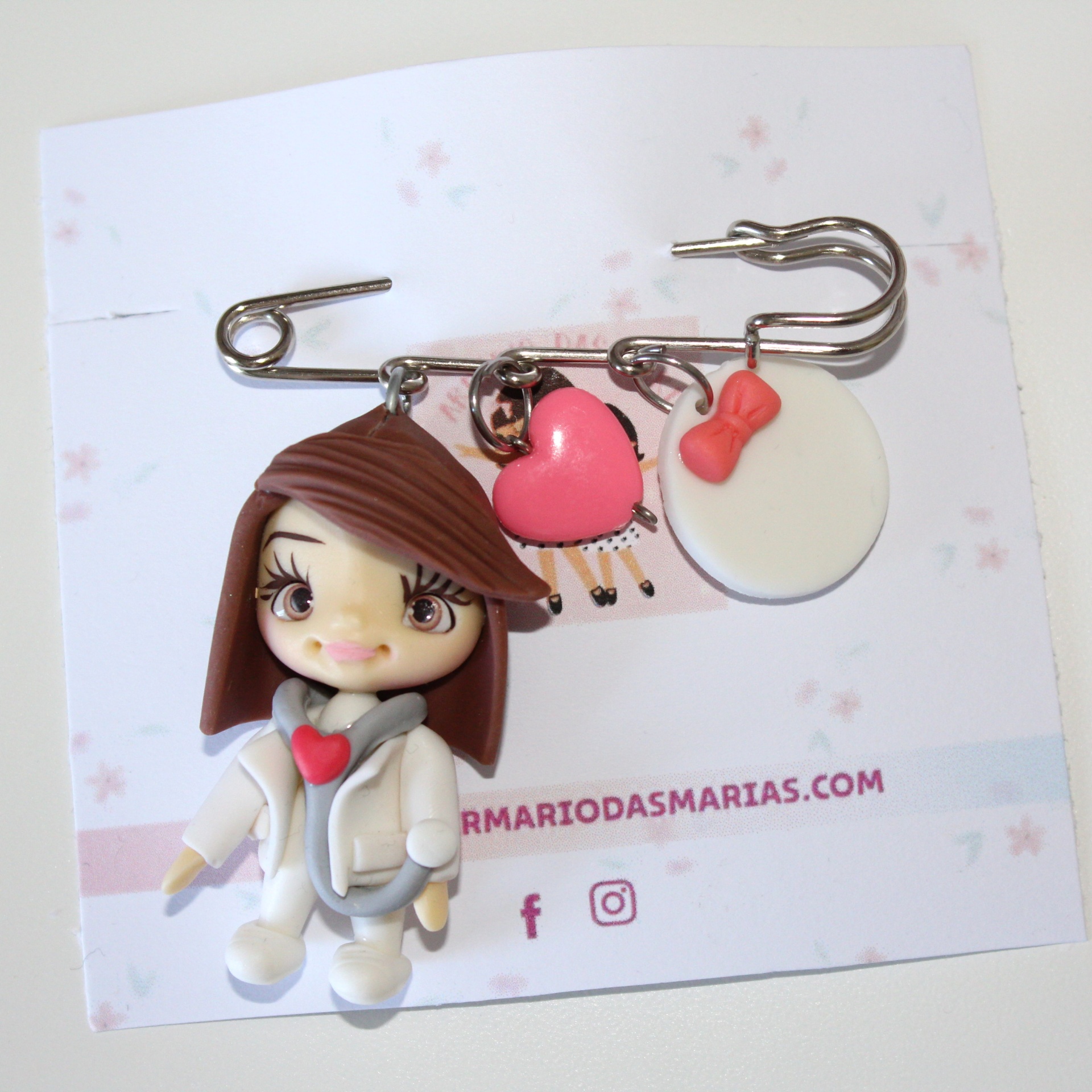 • Broche com pendente de boneco em caixa branca com enchimento rosa