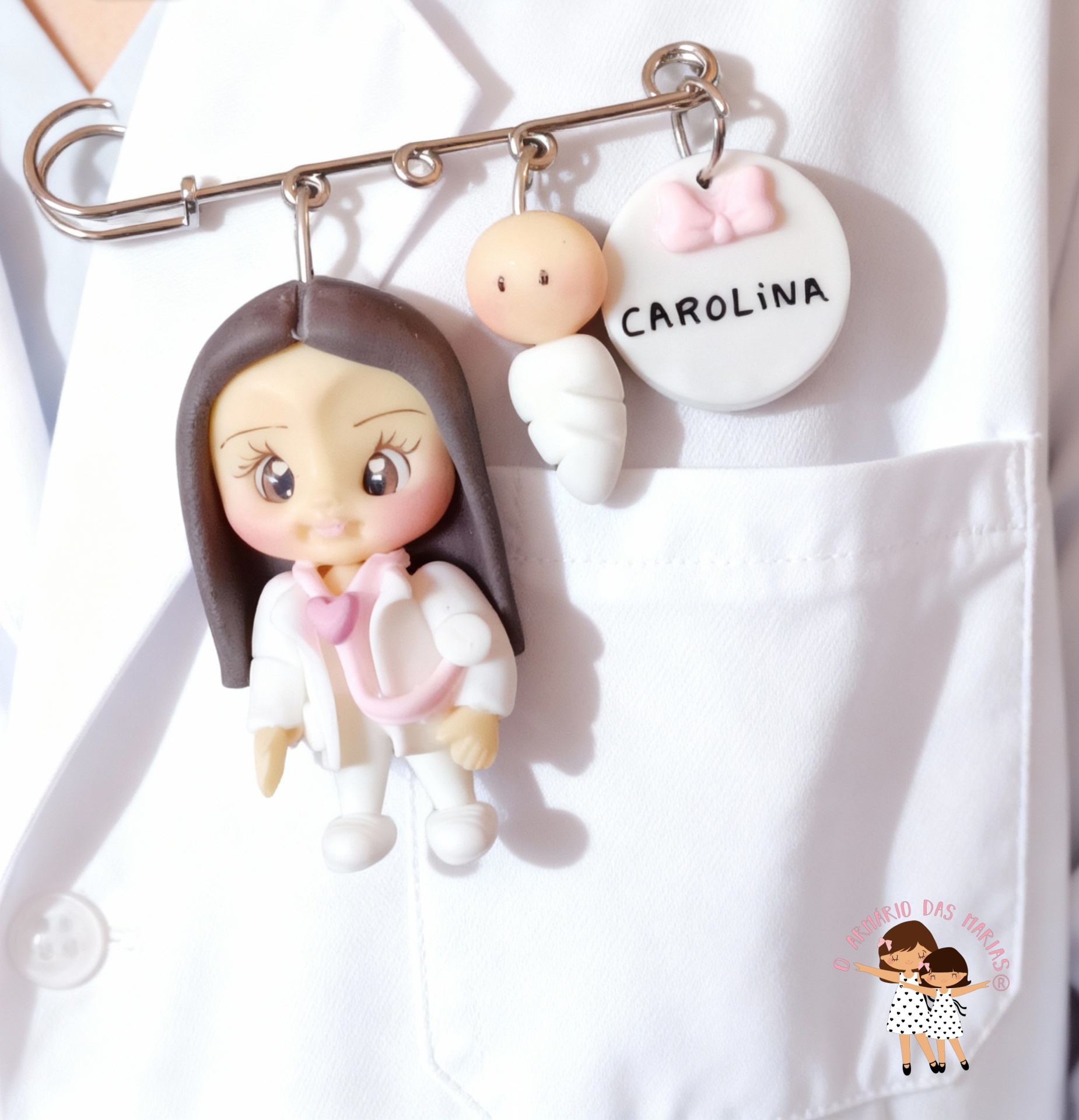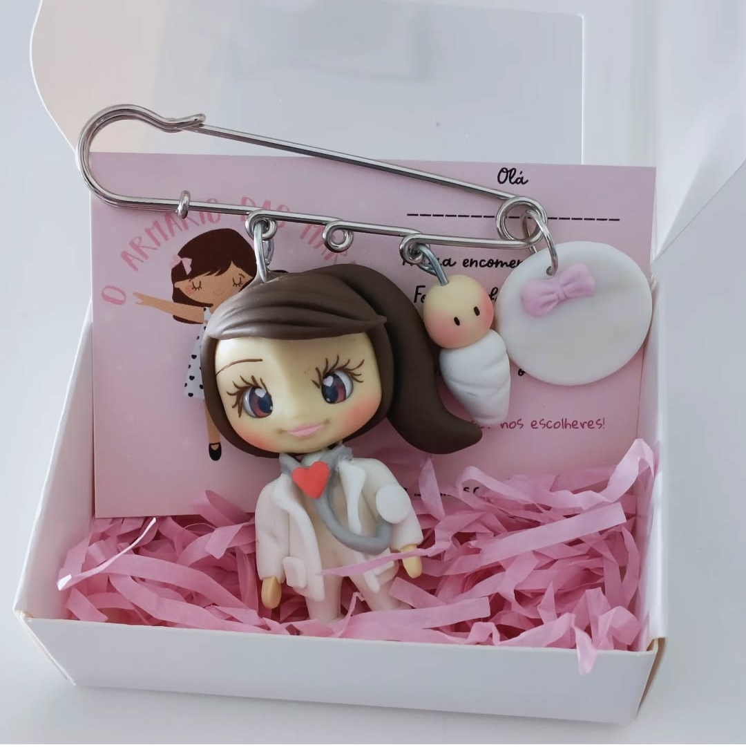 • Alfinete com pendentes de médica, bebé e laço rosa dentro de caixa branca com papel rosa
